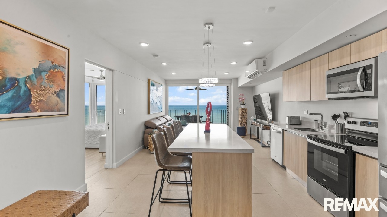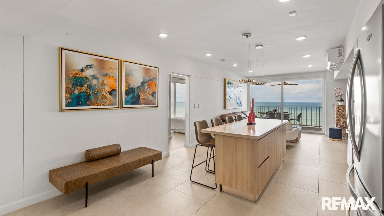 Step into a professionally designed space where the master bedroom features corner glass walls revealing sweeping Pacific Ocean views. Wake up to crashing waves and unwind each evening with the sun setting into the sea from your expansive oceanfront balcony, accessible from both the living room and master suite.