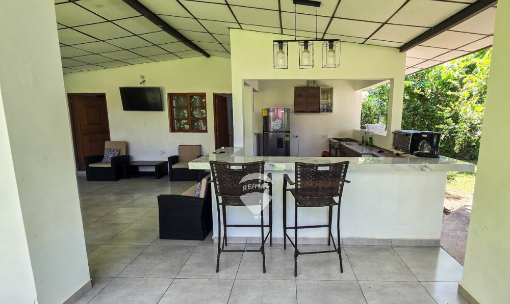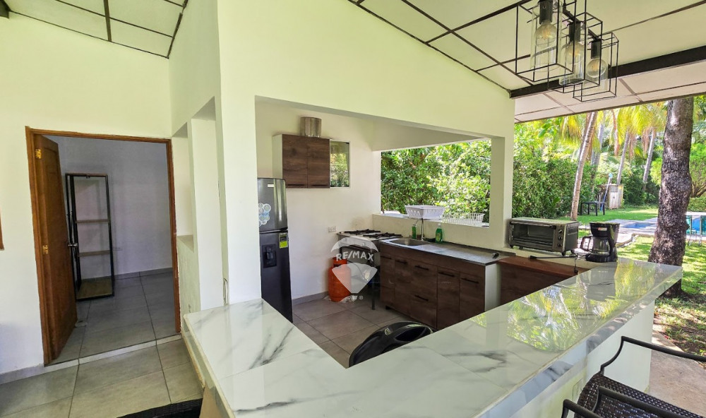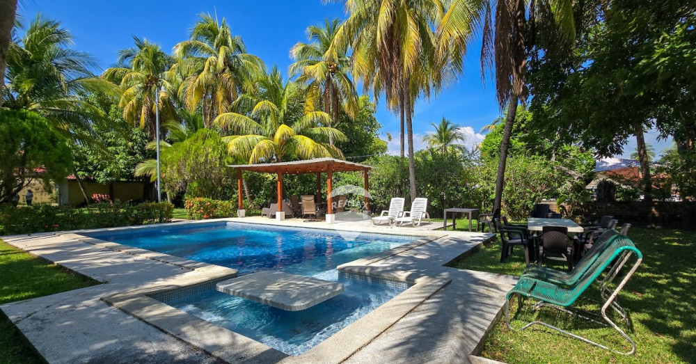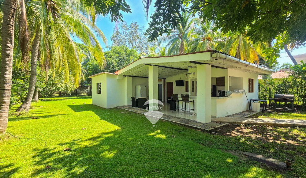 Single-level home: Living and dining room, kitchen, three bedrooms, two bathrooms, and a covered terrace facing the pool and spacious gardens.